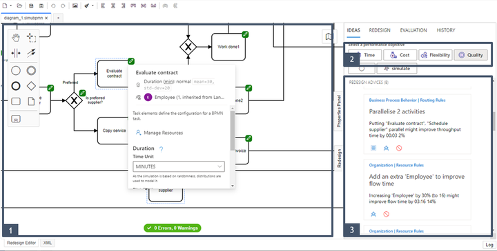 The software prototype is a web application that starts from an empty canvas or from an existing BPMN diagram. It enables the user to annotate and edit a process model and recommends redesign options based on the process model and a defined performance objective (i.e., time, cost, quality, and flexibility). The user can then apply these recommendations and evaluate their impact with simulation experiments. This procedure is repeated until satisfaction with the process model is achieved. In our prototype, we support process redesign patterns by Reijers & Limam Mansar (2005) in varying levels of automation: The triage and activity automation patterns are implemented as guided advice, the parallelism and extra resources pattern are implemented as advice whereas the remaining are implemented as hints and ideas.